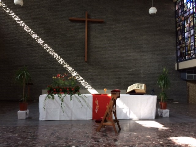 De liturgische kleur voor de dienst van deze middag is rood: Het vuur van de Geest.
