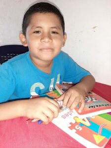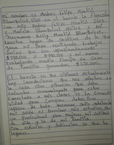 Zijn vader doet alle voorkomende werkzaamheden. Wat dat inhoud kwam ik al in mijn eerste weken in San Bernardo achter. Toen ik tijdens een vergadering met de ouders vroeg, wie kan er metselen, stak iedereen zijn hand op. Man, vrouw, jong en oud. Alle kinderen waarvan de ouders onder de armoedegrens [ 500.000 pesos per maand €125,00 met 4 personen ] verdienen krijgen de studieboeken gesponsord en waar nodig springen we bij met de aanschaf van studieboeken en uniform. Andres Felipe gaat naar de vierde klas en hij heeft deze brief zelf geschreven. Mijn naam is Andres Felipe Montiel
