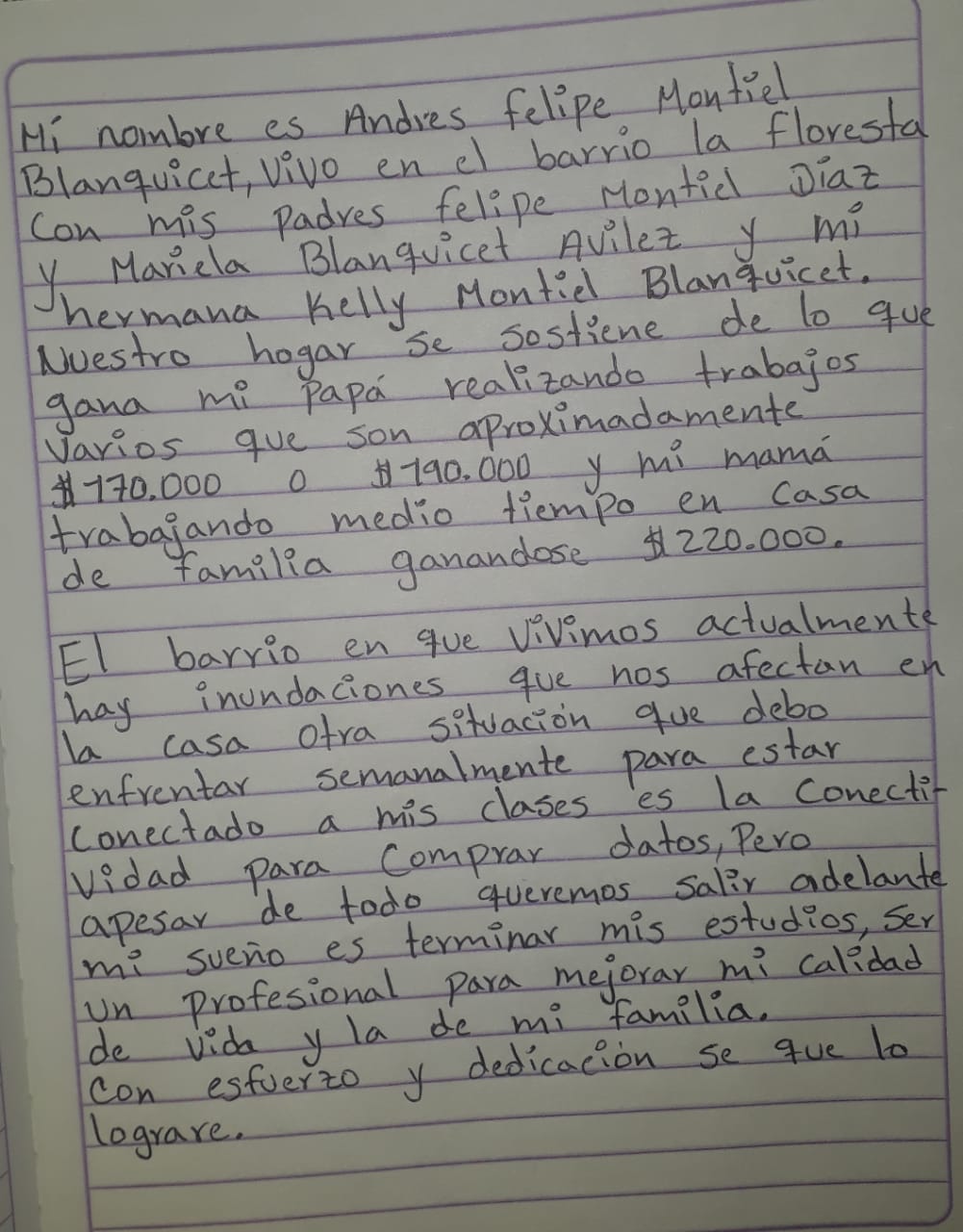 Blanquicet, ik woon in de wijk la Floresta met mijn ouders, Felipe Montiel Diaz en Mariela Blanquicet Avilez en mijn zuster Kelly Montiel Blanquicet. Wij leven van wat mijn vader met verschillende werkzaamheden verdiend. Dat is ongeveer 180.000 pesos [ €45,00 ] per maand en wat mijn moeder verdiend . Zij werkt als hulp in de huishouding bij een familie, daar verdiend zij 220.000 pesos [ € 55,00 ] In de wijk waar wij wonen zijn op dit moment overstromingen en daar hebben we veel last van. Een ander probleem waar we elke week mee leven is het hebben van bel tegoed. Dat moeten we kopen anders kan ik mijn virtuele lessen niet volgen. Maar ondanks al deze problemen wil ik vooruit komen. Mijn droom is het volbrengen van mijn opleiding. Om later een professionele opleiding te hebben volbracht zodat ik mijn eigen leven en het leven van mijn familie kan verbeteren. Met veel inzet en toewijding wil ik dat realiseren.