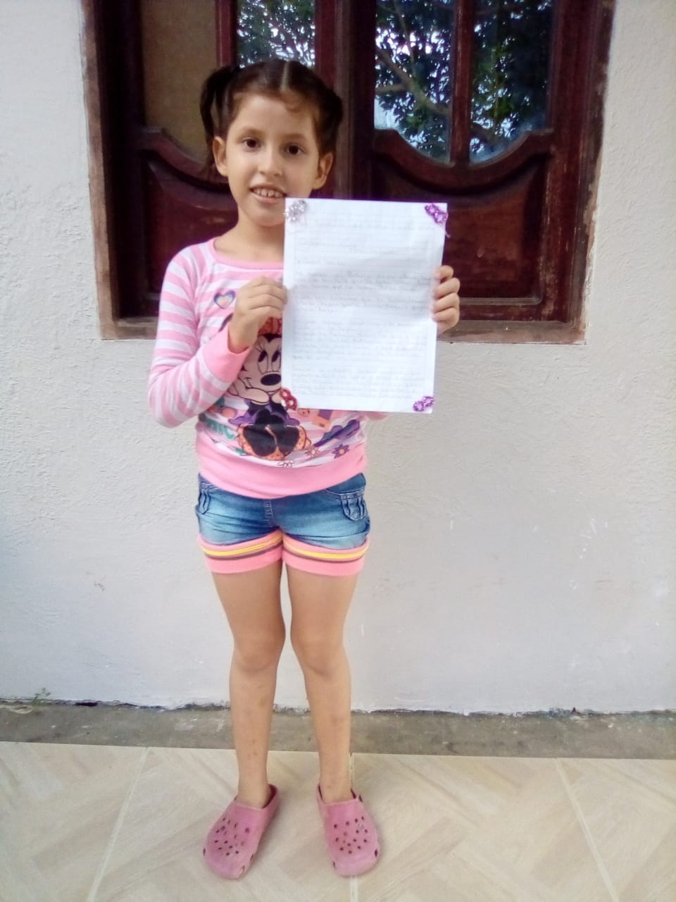 De profesora is heel bezorgt en houd veel van ons. Ik ben gelukkig en wil vooruit komen met mijn studie. Ik wil veel leren zodat ik mijn broers en mijn ouders later kan helpen.