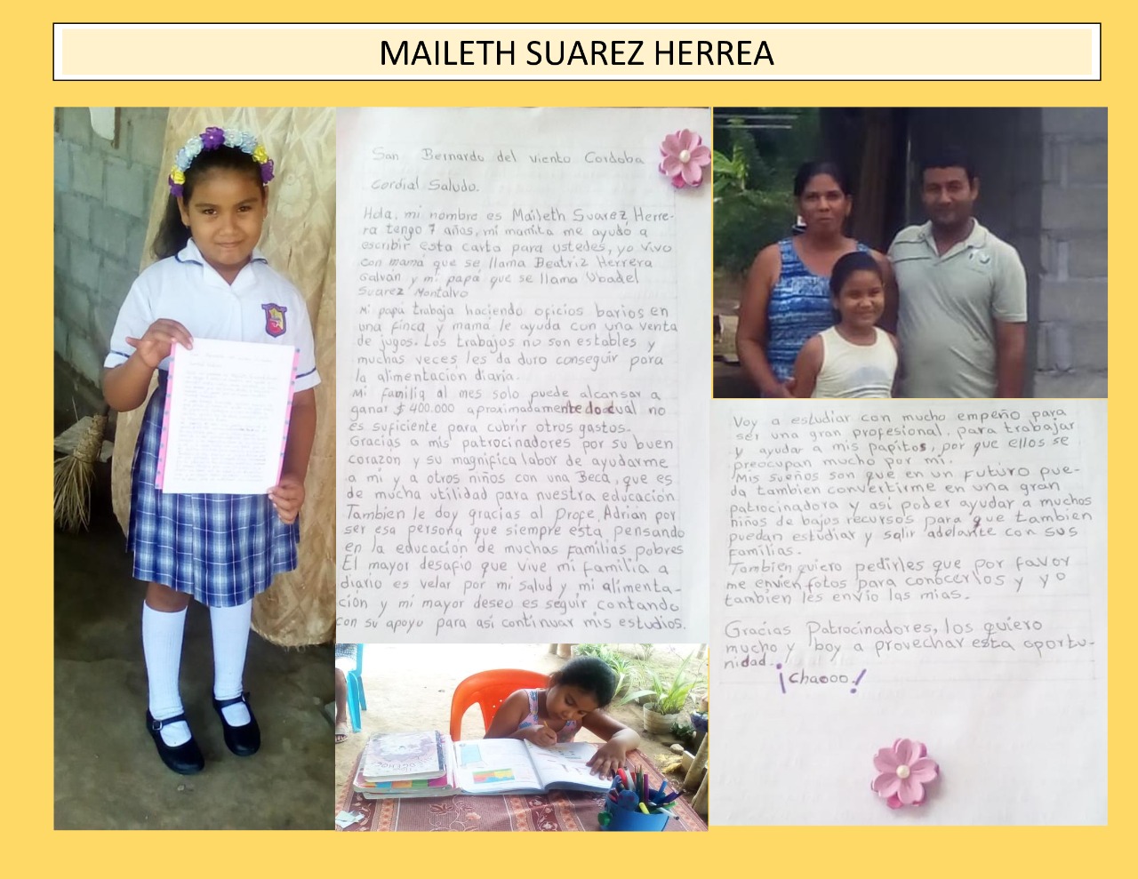 Hallo, mijn naam is Mailet Suarez Herrera. Ik ben 7 jaar en mijn moeder heeft me geholpen om deze brief te schrijven voor jullie. Ik woon met mijn moeder, die Beatriz Herrera Galvan heet en mijn vader die Ubadel Suarez Montalvo heet.