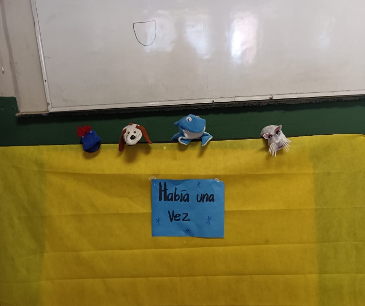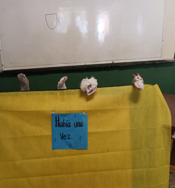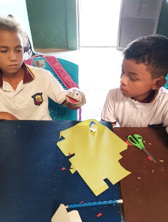 Vervolgens moesten de kinderen een verhaal lezen met de opdracht om elke verhaal met zijn drieën door middel van de handpoppen door te vertellen aan de andere kinderen. Dat betekende dat ze het uit te beelden verhaal heel goed moesten lezen, omdat ze elk een andere persoon moesten uitbeelden.