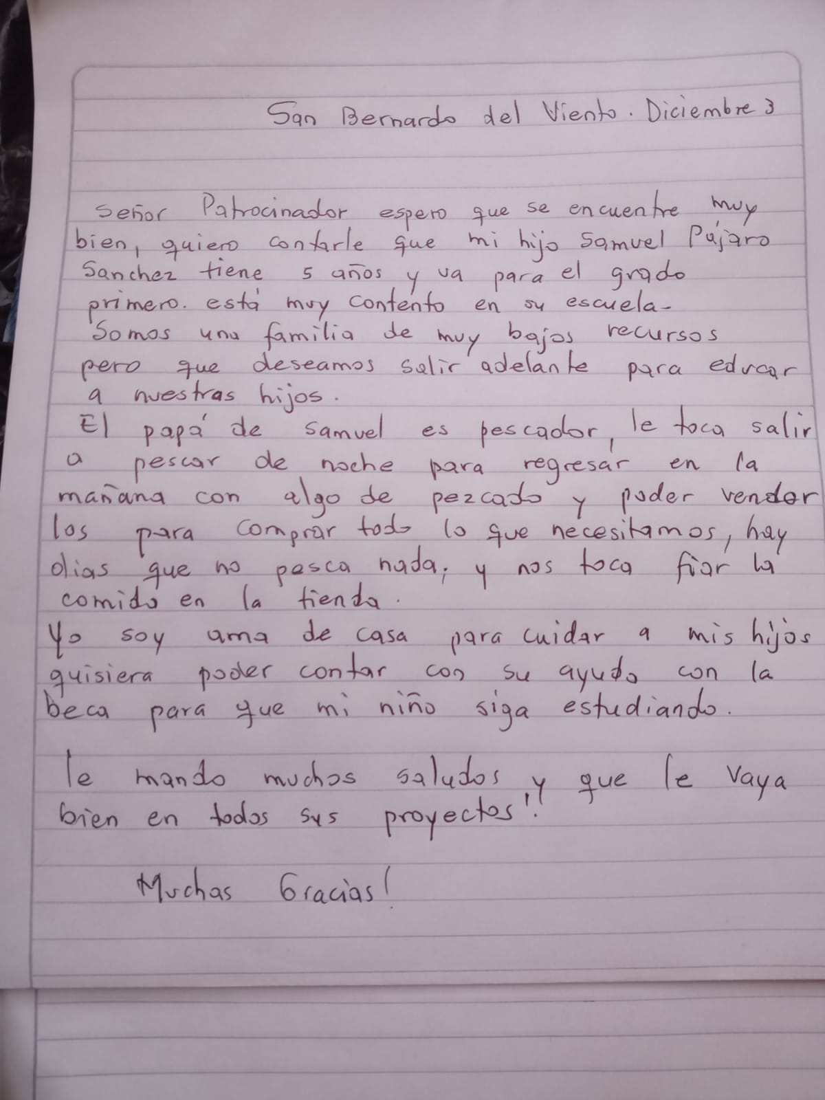 Ik wil U vertellen dat mijn zoon Samuel Pajaro Sanches vijf jaar oud is en dat hij naar de eerste klas gaat.