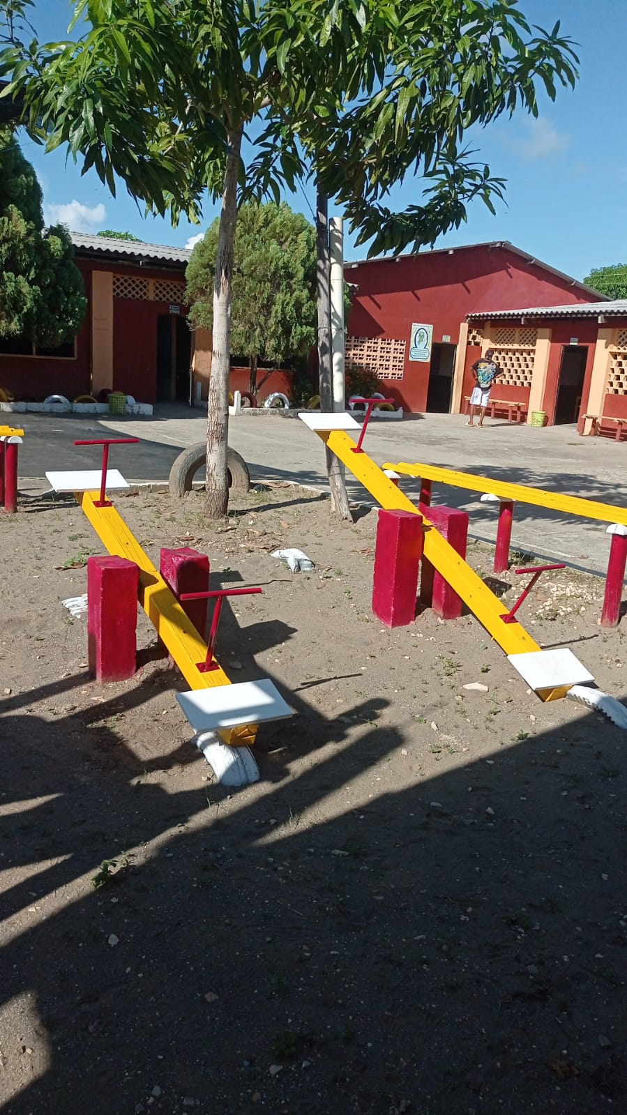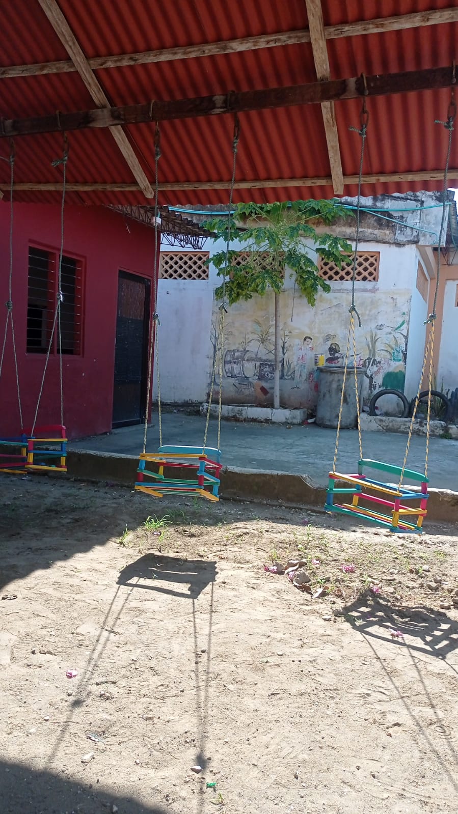 Het was de bedoeling dat we de schommels van oude autobanden zouden laten maken. Die zijn een stuk steviger en hebben dus minder onderhoud nodig. Maar diegene die ze zou maken kwam met een prototype waarbij we elke dag nieuwe uniformen zouden moeten kopen voor de kinderen. De ijzerdraad stak er aan alle kanten uit. Daar hebben we dus maar vanaf gezien.