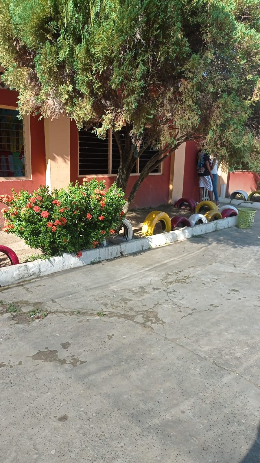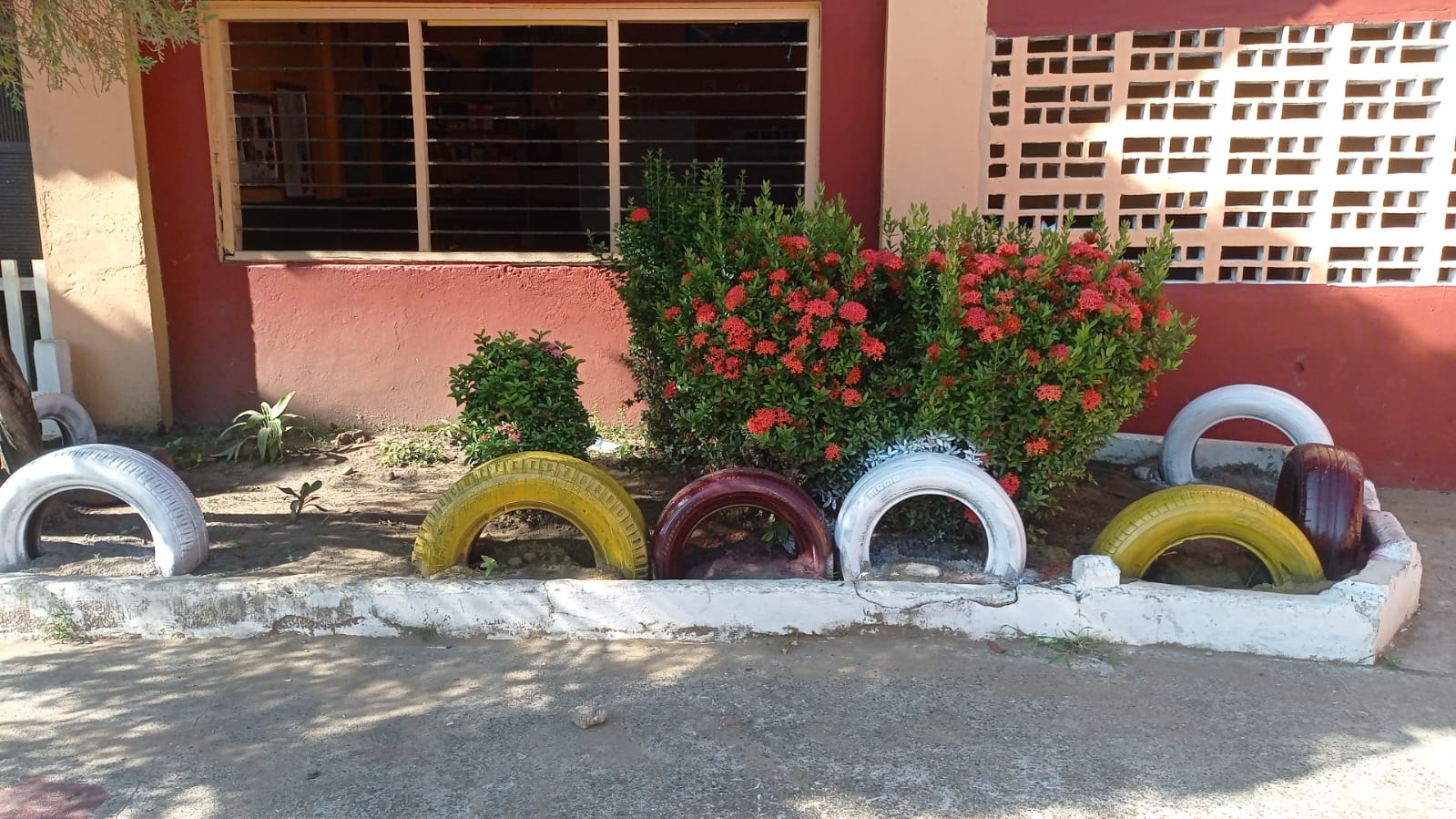 We hebben alles opnieuw in de verf gezet in de kleuren van onze school. We hebben oude autobanden een nieuw leven gegeven en deze in al onze groenstroken geplaatst. Ze zijn allemaal in de verf gezet. Het ziet er heel kleurrijk uit en onze planten zijn meteen beschermd voor onze leerlingen die zo niet meer de groenstroken als speelgebied kunnen gebruiken.