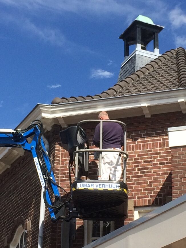Afbeelding met gebouw, buiten, klok, baksteen Automatisch gegenereerde beschrijving Twee weken lang waren er schilders bezig met schilderwerk aan de kerk en de pastorie.